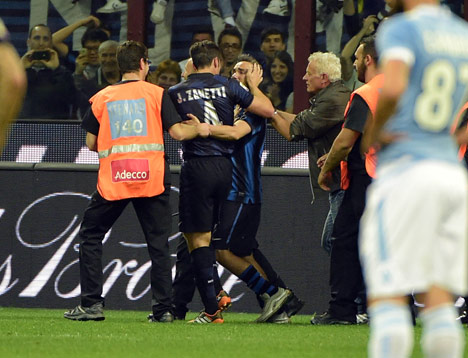 (Seorang tifosi menerobos masuk lapangan untuk memeluk Zanetti di penghujung laga © AFP)