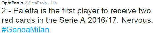 Paletta tercatat sebagai pemain pertama yang mengoleksi dua kartu merah di Serie A 2016/17.