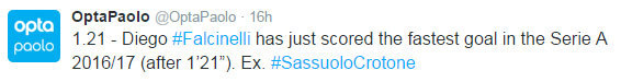 Gol itu dicetak oleh striker 25 tahun Italia Diego Falcinelli dari pihak Crotone. Gol tersebut dicetaknya hanya 1 menit 21 detik dari kick-off babak pertama.