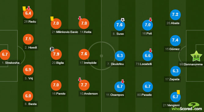 Donnarumma menetralisir sembilan tembakan tepat sasaran Lazio yang dilepaskan Keita (3) Biglia (2), Ciro Immobile (2), Wesley Hoedt dan Felipe Anderson. Hanya eksekusi penalti Biglia yang lewat dari penjagaannya.