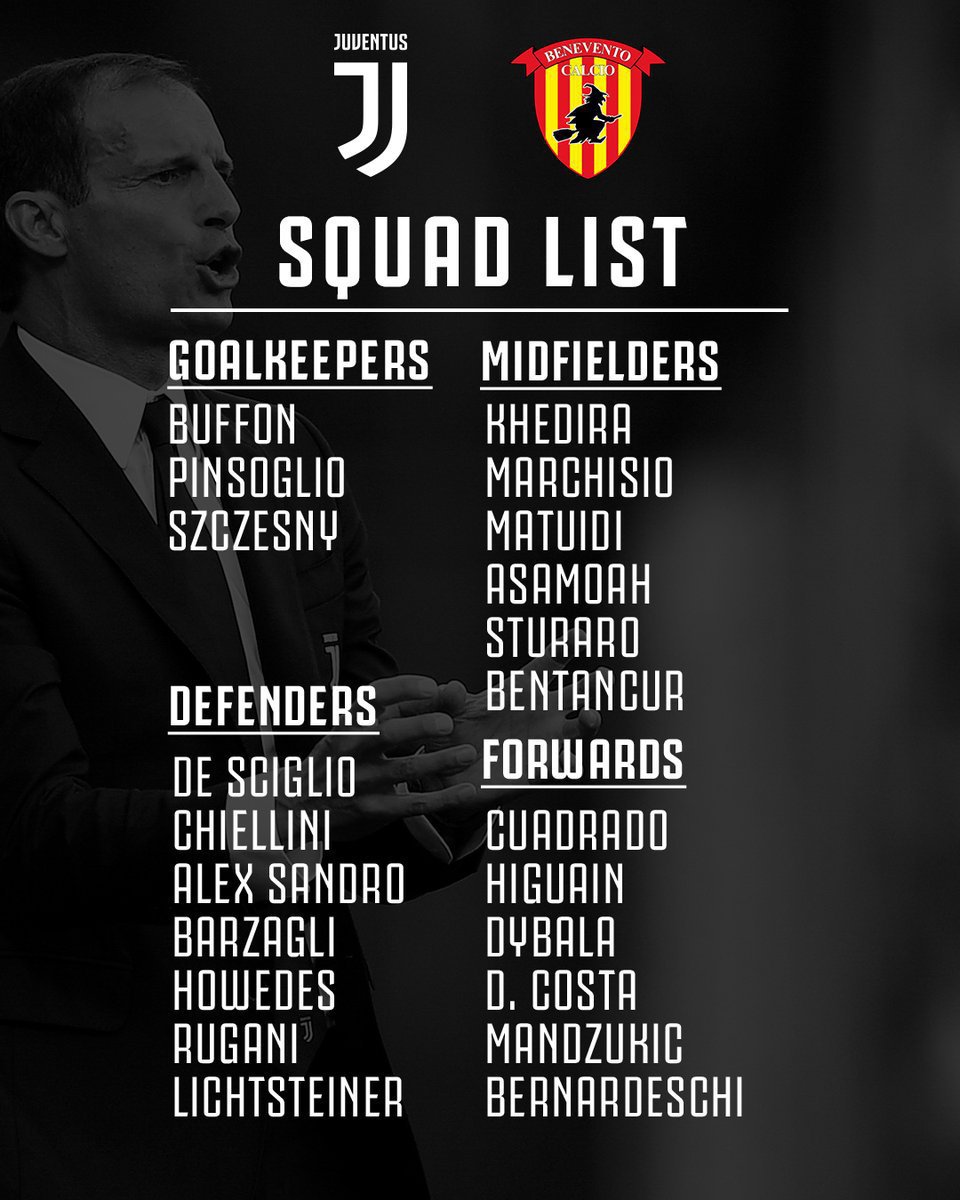 Skuat Juventus: Buffon, De Sciglio, Chiellini, Khedira, Cuadrado, Marchisio, Higuain, Dybala, Douglas Costa, Alex Sandro, Matuidi, Barzagli, Pinsoglio, Mandzukic, Howedes, Asamoah, Szczesny, Rugani, Lichtsteiner, Sturaro, Bentancur, Bernardeschi.