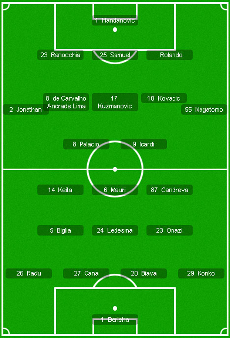 Handanovic; Rolando, Samuel, Ranocchia; Nagatomo, Kovacic, Kuzmanovic, Hernanes, Jonathan; Icardi, Palacio.
