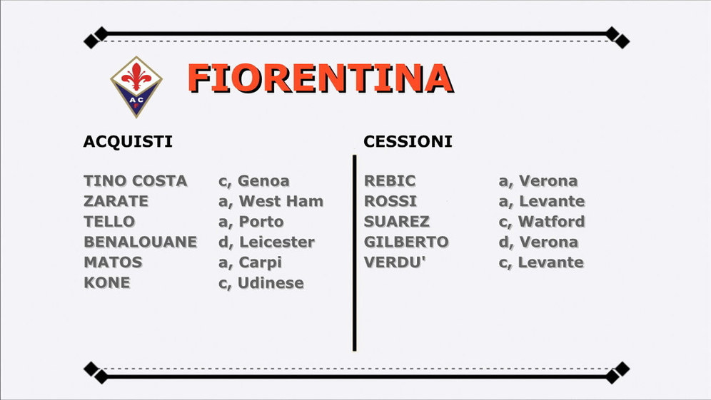 Cristian Tello dipinjam Fiorentina dari Barcelona via FC Porto. Tino Costa dipinjam dari Spartak Moscow via Genoa. Sementara itu, Ryder Matos, yang baru kembali dari Carpi, dijual ke Udinese seharga €3 juta. [initial]