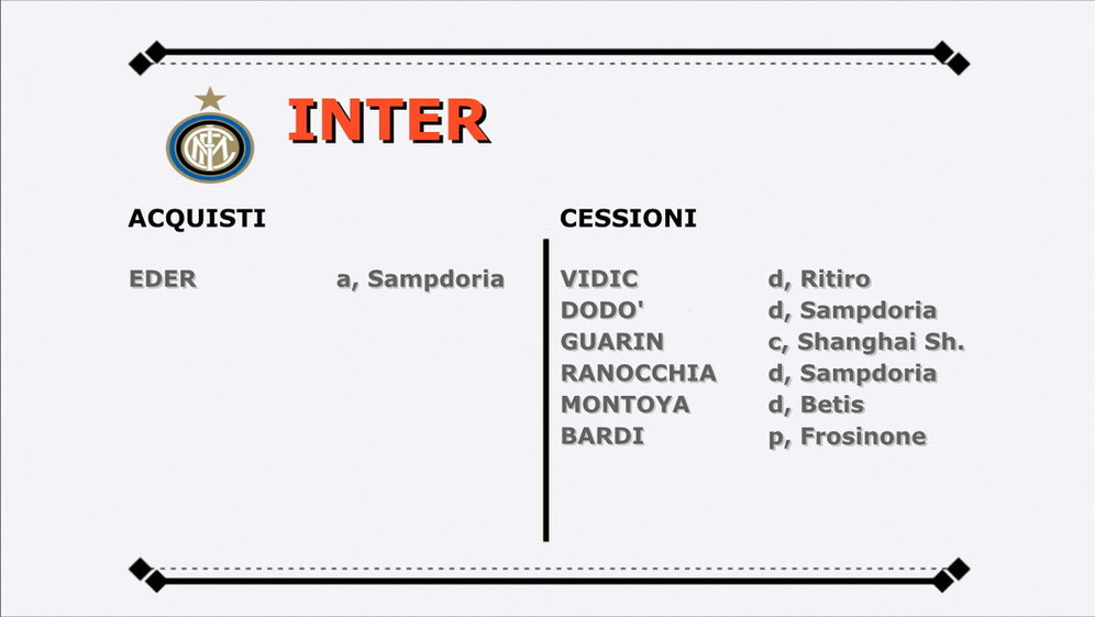 Martin Montoya dikembalikan ke Barcelona, dan oleh Barcelona langsung dipinjamkan ke Real Betis. Sementara itu, Nemanja Vidic mengakhiri kontraknya dengan Inter pada 18 Januari 2016. Sebelas hari kemudian, Vidic mengumumkan pensiun. [initial]