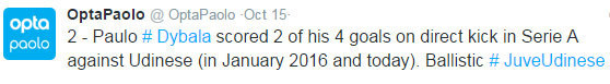 Dybala sudah mencetak empat gol direct free kick alias tendangan bebas langsung di Serie A. Dua dari empat gol tendangan bebas langsung itu dicetaknya ke gawang Udinese.