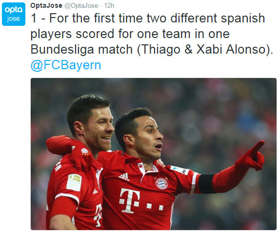 Untuk pertama kalinya sepanjang sejarah persepakbolaan Jerman, ada dua pemain yang mencetak gol untuk satu tim yang sama dalam sebuah pertandingan Bundesliga. Thiago dan Alonso lah orangnya.