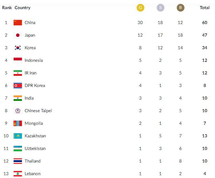 Posisi puncak klasemen masih tetap jadi milik China yang melaju kencang. China kini telah mengumpulkan 60 medali yang terdiri dari 30 emas, 18 perak dan 12 perunggu.