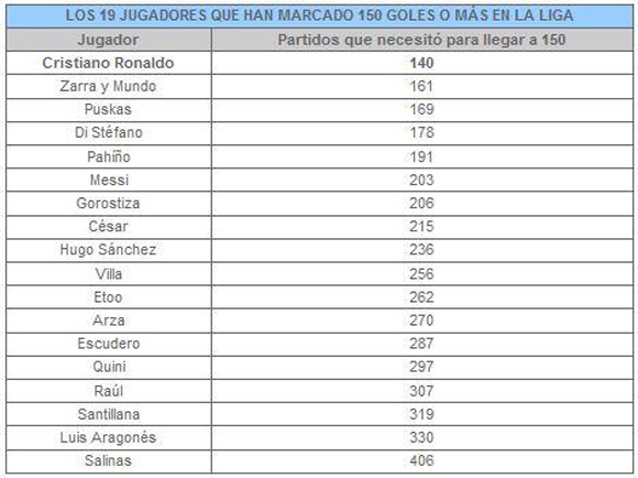 1. Tak ada pemain lain dalam sejarah La Liga yang mencetak 150 gol lebih cepat dari Cristiano Ronaldo.