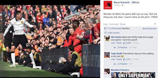 Merasa dirinya sangat diperhatikan dan dihargai oleh para fans, Balo mengungkapkan rasa terimakasihnya atas perlakuan tersebut. Melalui akun Facebooknya, Super Mario menunggah foto saat dirinya sedang dipegangi dengan caption 'Besides all efforts the game didn’t go our way. But one thing was real clear: I wasn’t alone on the pitch. YNWA' atau jika diartikan kurang lebih berarti 'Meski semua usaha yang dikeluarkan tidak berujung pada hasil yang diharapkan, namun satu hal yang pasti, saya tidak sendirian di lapangan. YNWA'.