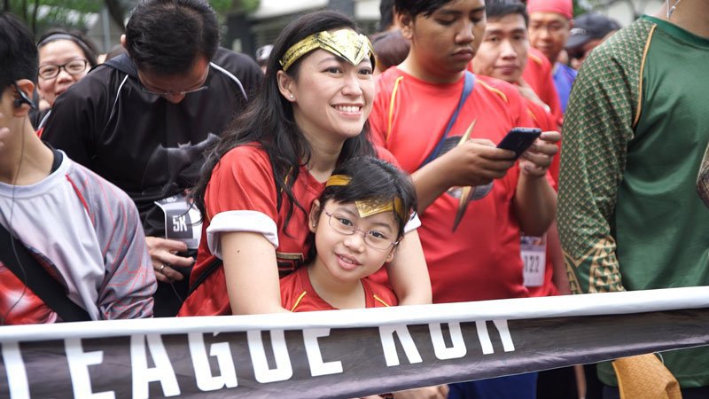 Pasangan Ibu dan Anak ini bersiap-siap sebelum lari dimulai. Cocok banget ya mereka pakai race pack Wonderwoman.