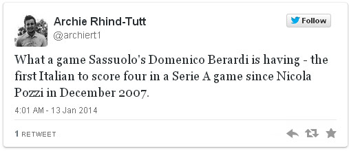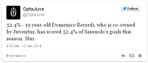 (Berardi mencetak 11 dari 21 gol Sassuolo di Serie A 2013/14 sejauh ini). [initial]