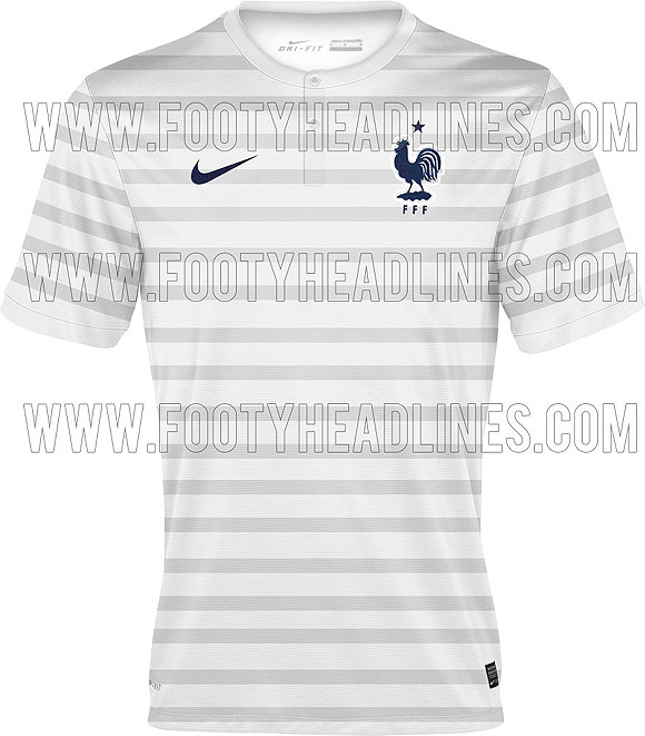 Setelah jersey home berwarna navy blue resmi diluncurkan, situs Footyheadlines kini merilis gambar yang diyakini bakal menjadi jersey away Les Bleus. Jersey produksi Nike ini berkesan classy, sama seperti jersey home Prancis 2014.