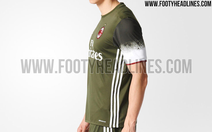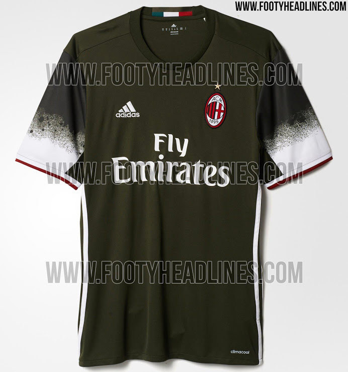 - Jersey ketiga AC Milan untuk musim 2016/17 bakal berwarna hijau gelap. Detail putih di beberapa bagian, termasuk ujung lengan, menjadi pelengkap.