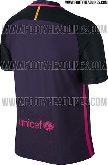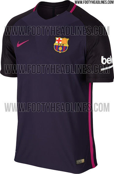 - Ini adalah jersey tandang yang diyakini bakal dipakai oleh Barcelona di musim 2016/17. Dilansir Footy Headlines, jersey tandang ini memakai kombinasi warna ungu dan hitam serta sedikit aksen merah muda.