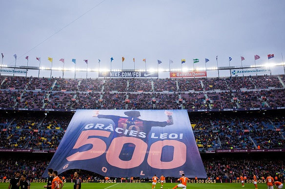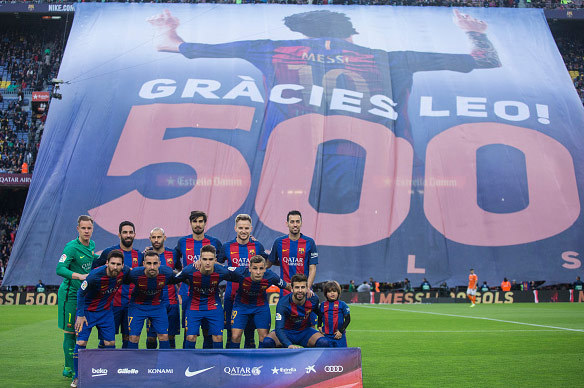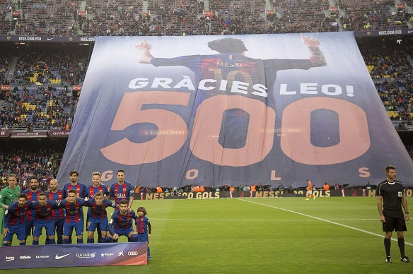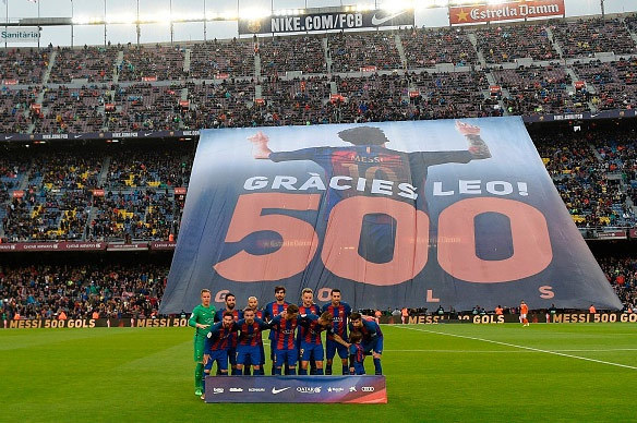 Sebelum laga melawan Osasuna, sebuah banner raksasa dibentangkan di satu sisi tribun Camp Nou. Banner tersebut merupakan tanda ucapan terima kasih kepada Messi untuk 500 gol yang telah dicetaknya dengan seragam Barcelona.