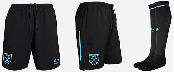 Jersey away West Ham ini berwarna dominan hitam dengan tambahan aksen biru muda. Ini adalah jersey all-black pertama yang dimiliki oleh West Ham. Warna biru muda dipakai untuk logo klub, logo Umbro dan juga pita running diamond.