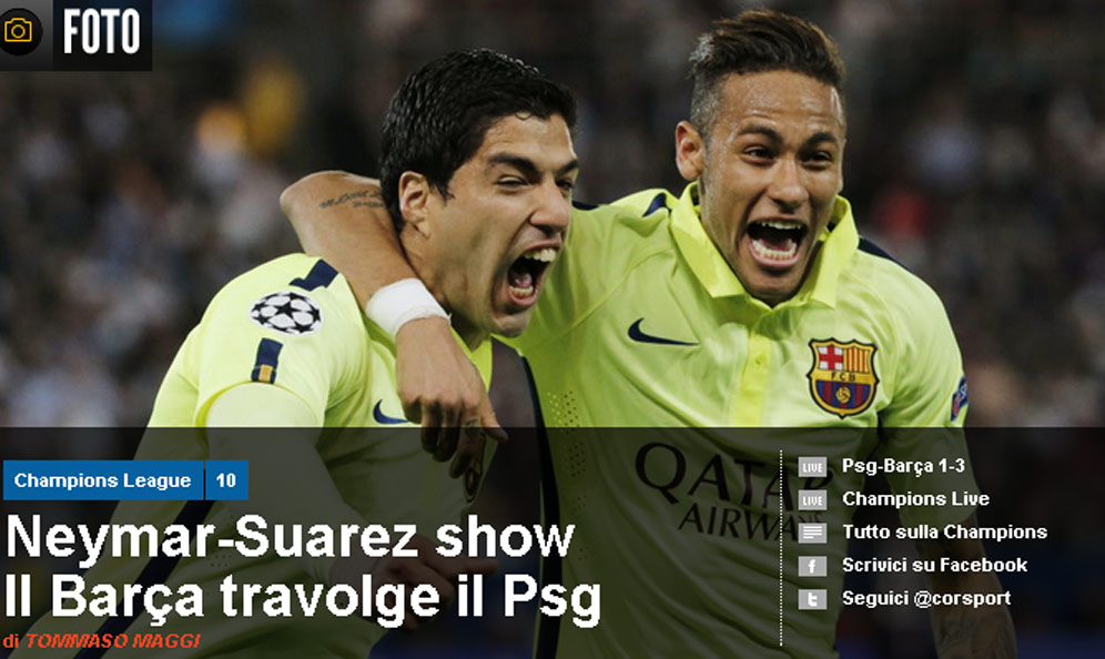 Corrierre dello Sport: Neymar-Suarez Show, Barca Gilas Paris.