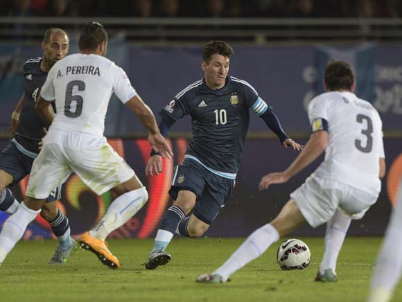 Bola.net - Lionel Messi terpilih sebagai Man of the Match ketika Argentina mengalahkan Uruguay 1-0 lewat gol tunggal Sergio Aguero pada pertandingan kedua Grup B Copa America 2015. Messi tidak mencetak gol maupun assist, tapi aksi-aksi kapten Argentina dan bintang Barcelona itu begitu memukau dan berulang kali membuat lawan kewalahan.