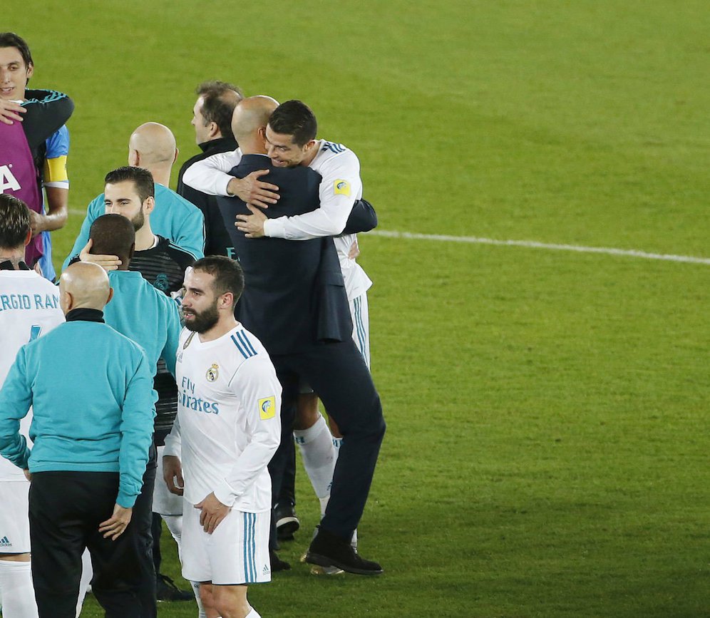 Foto 13: Zidane memeluk Cristiano Ronaldo pada sebuah laga di musim 2017/18