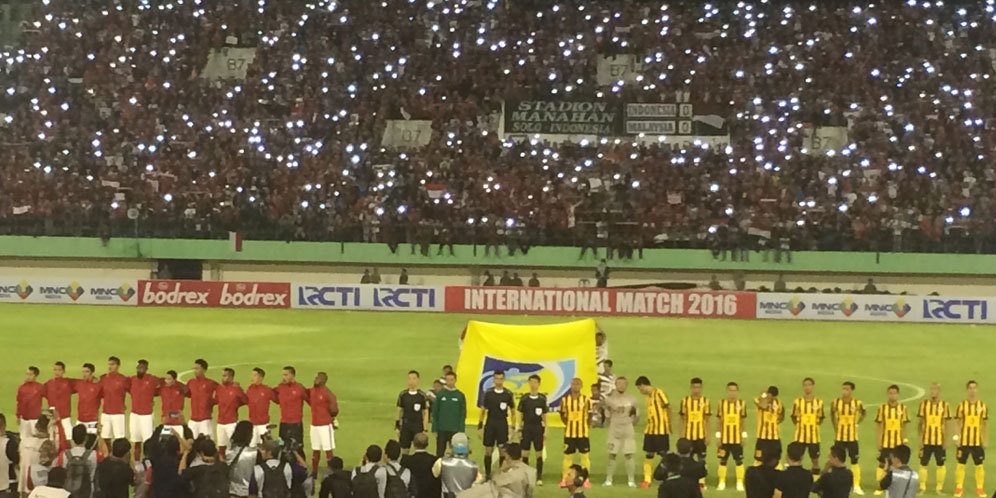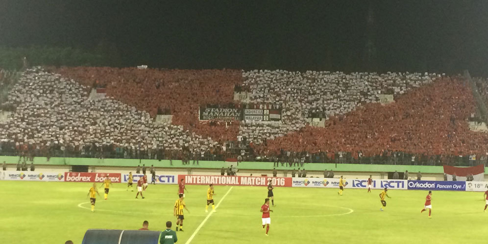Di tribun utara koreografi yang disajikan berbentuk tulisan Garuda berwarna merah dengan warna dasar putih. Sementara di tribun yang lebih luas koreografi yang ditampilkan juga berbentuk warna merah putih. Di sisi selatan lebih banyak warna pendukung. Selain merah putih di tengah, di pinggir barat dan timur penonton memadukan bendera berwarna kuning dan hijau.