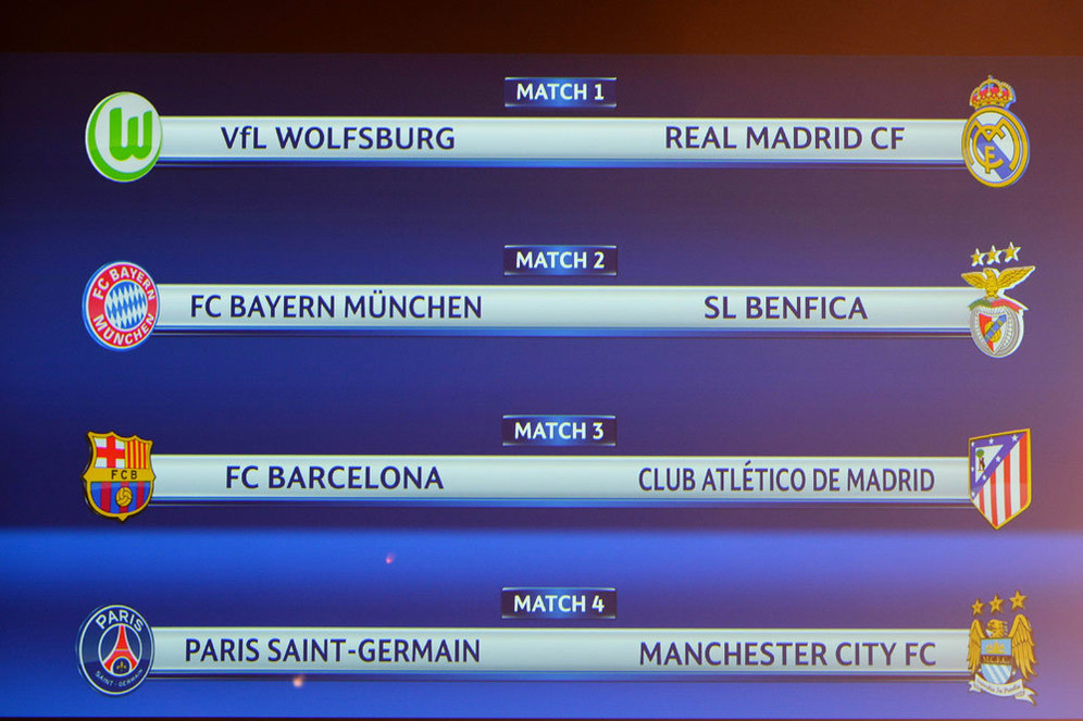 Hasil undian mempertemukan Wolfsburg vs Real Madrid, Bayern Munchen vs Benfica, Barcelona vs Atletico Madrid dan PSG vs Manchester City. Menariknya, hasil undian ini sama dengan urutan para perempat finalis di awal yang namanya disusun berdasarkan abjad.