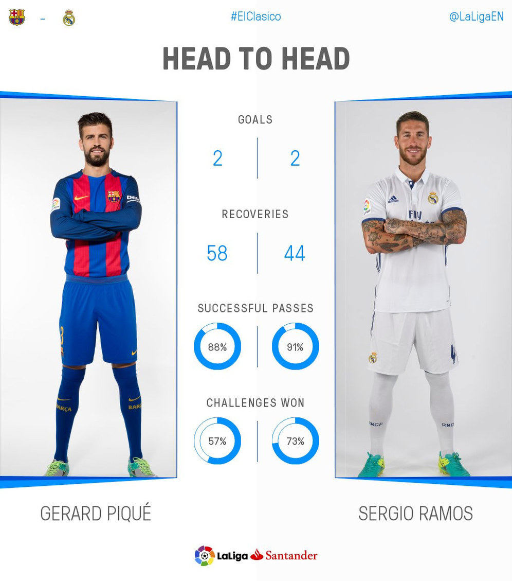 Bola.net - - El Clasico sudah di depan mata. Menuju duel klasik penuh gengsi antara Barcelona melawan Real Madrid di Camp Nou ini, La Liga merilis infografis perbandingan statistik para pemain kunci dari masing-masing tim.