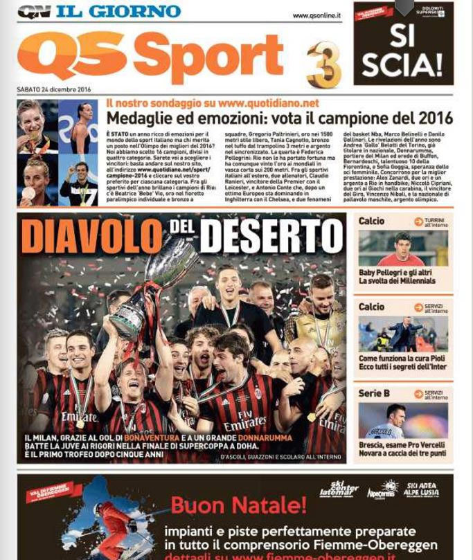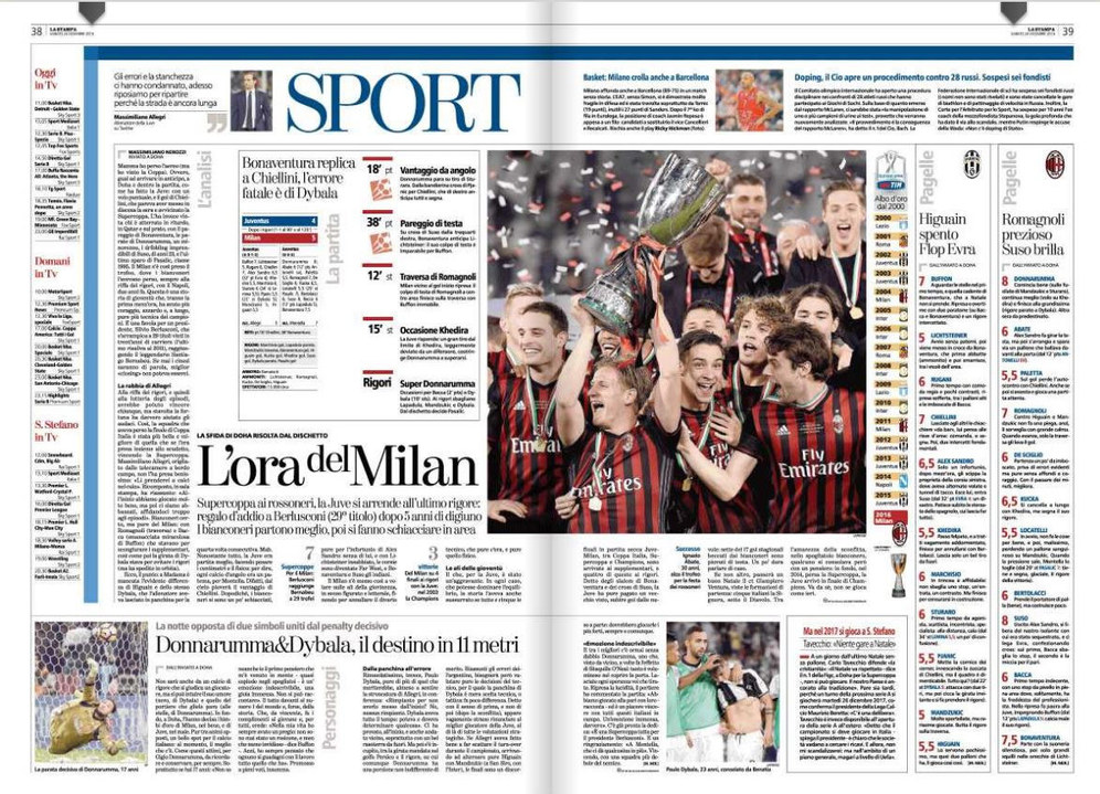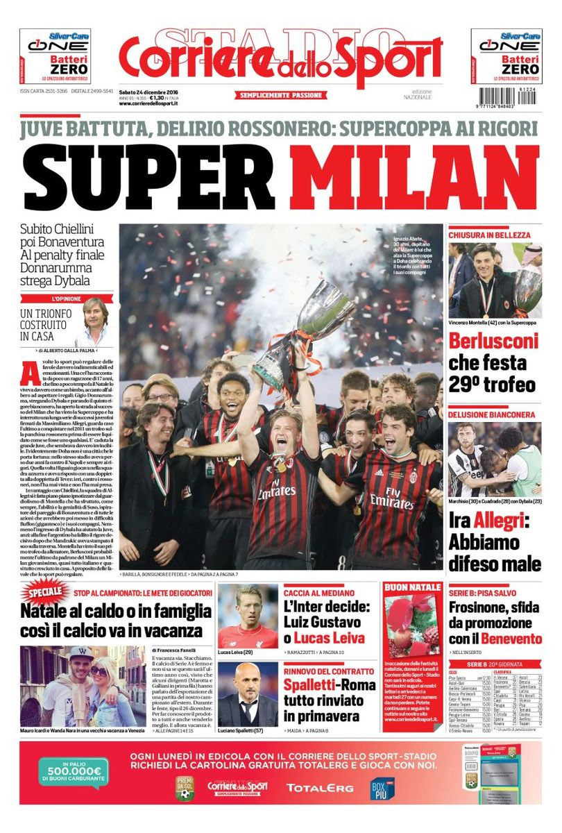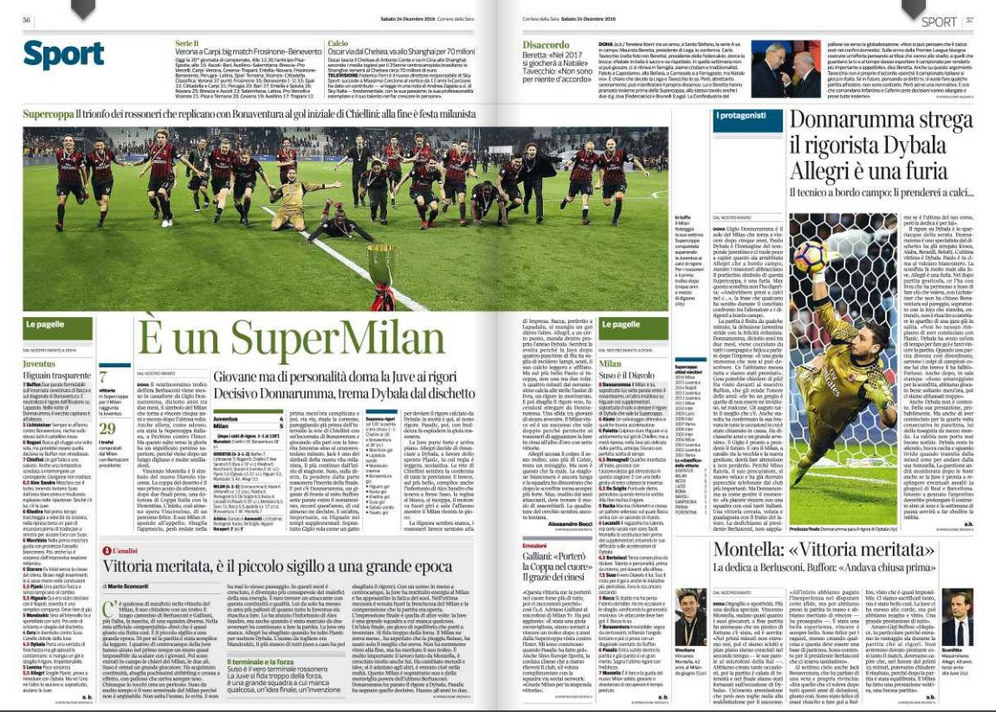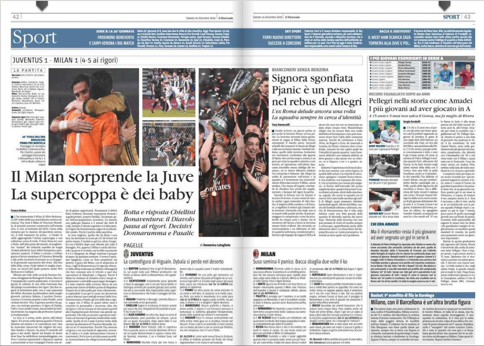 Bola.net - - Keberhasilan AC Milan menjuarai Supercoppa Italiana 2016 menjadi headline media-media cetak Italia. Sebagian besar memilih kiper Gianluigi Donnarumma sebagai 'aktor utama' dan menulis tajuk yang sama: Super Milan!