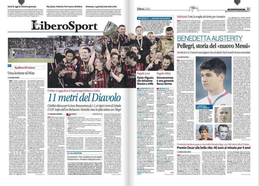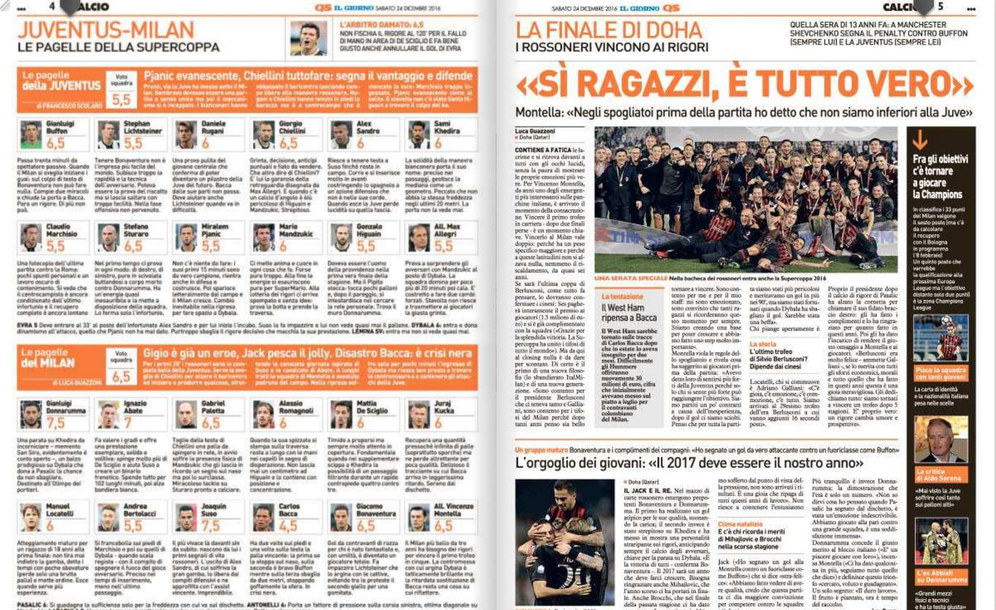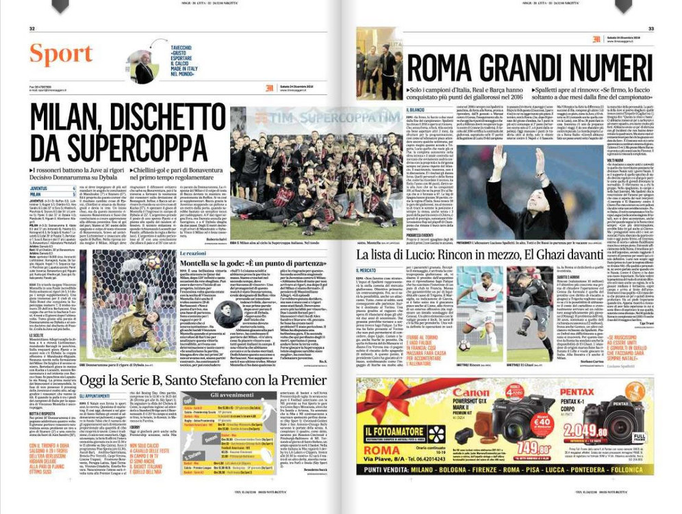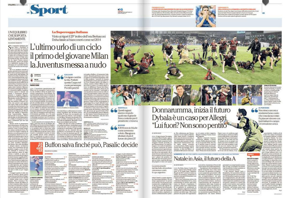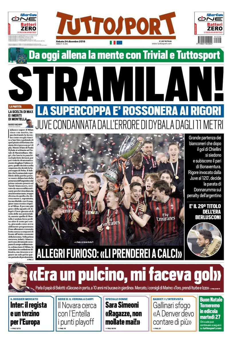 Bola.net - - Keberhasilan AC Milan menjuarai Supercoppa Italiana 2016 menjadi headline media-media cetak Italia. Sebagian besar memilih kiper Gianluigi Donnarumma sebagai 'aktor utama' dan menulis tajuk yang sama: Super Milan!