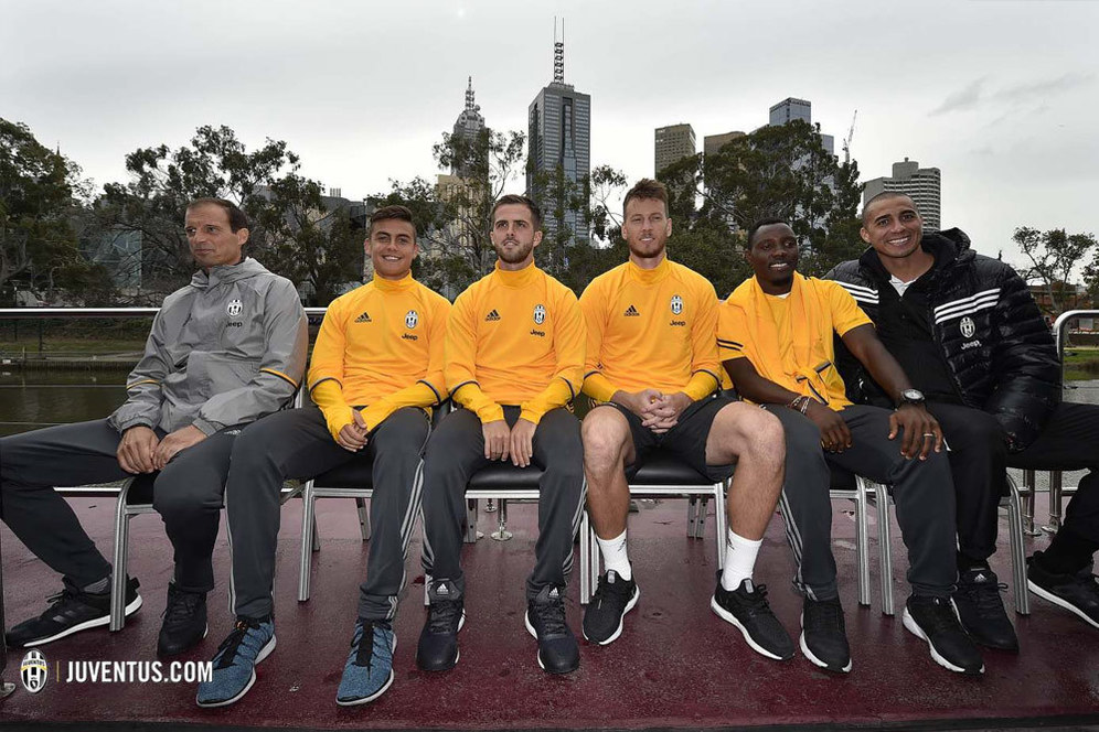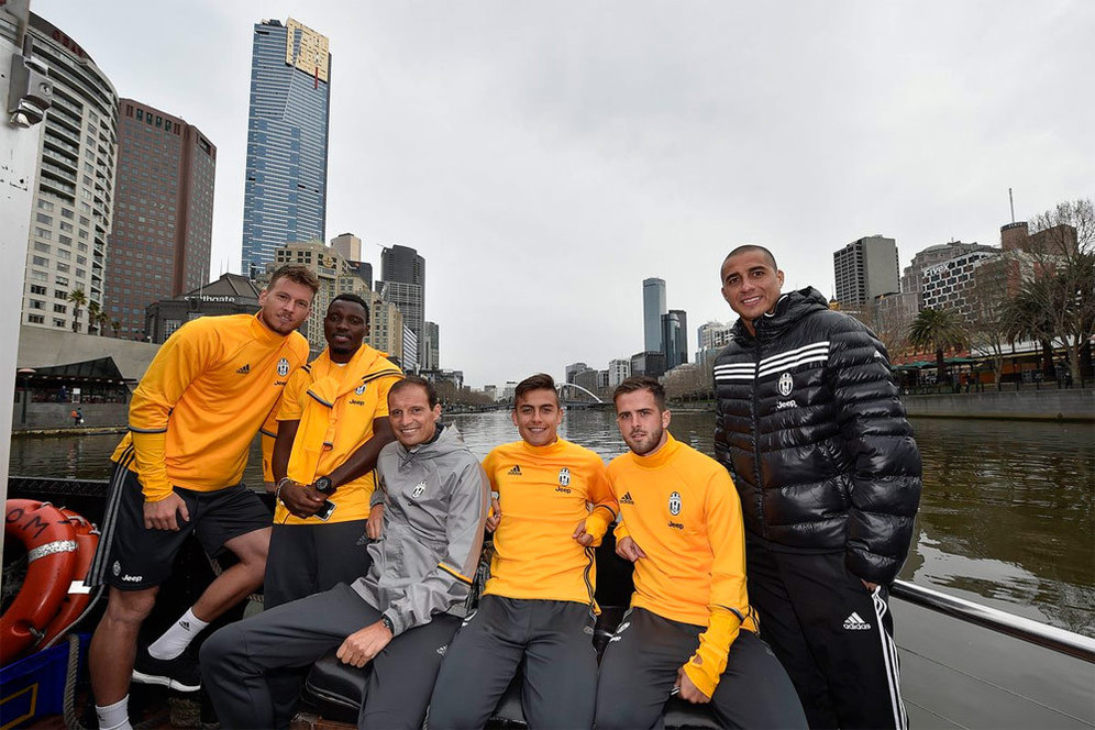 - Para pemain dan staf Juventus sedang berada di Melbourne, Australia, dalam rangkaian tur pramusim 2016. Salah satu kegiatan santai mereka begitu tiba di Negeri Kanguru tersebut adalah menyusuri sungai Yarra dengan perahu.