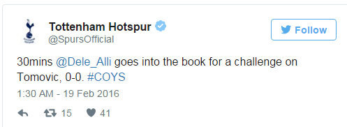Mantan wasit Inggris yang kini menjadi pundit, Howard Webb, mengomentari tindakan Dele Alli tersebut dalam analisis half-time di BT Sport. Webb berkata: "Dia pemain berbakat, tapi dia juga perlu menjaga sikap. Dia bisa mendapatkan reputasi yang buruk." [initial]