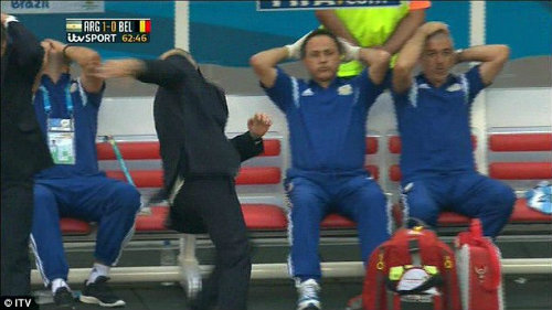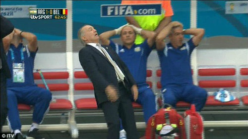 Ia terlihat cukup tegang. Dan akhirnya ada satu ekspesi spontan, yakni nyaris jatuh ke belakang dari posisi berdiri, ketika tendangan Gonzalo Higuain mengenai mistar gawang Belgia.