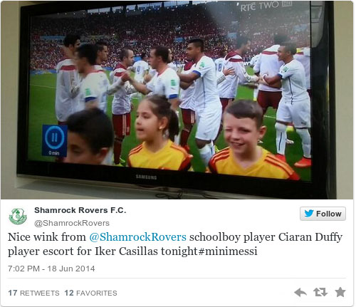 Duffy bisa terbang ke Brasil karena Federasi Sepakbola Irlandia telah menunjuknya menjadi perwakilan negaranya untuk menjadi maskot, yang bertugas mendampingi pemain masuk ke dalam lapangan.