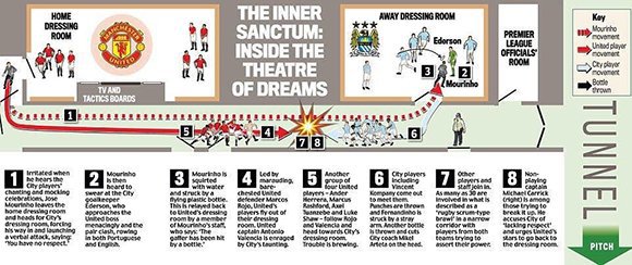 Keributan pun pecah. Staf Mourinho berlari kembali ke ruang ganti timnya, memanggil bala bantuan. "Pelatih dilempar botol oleh Man City," teriak staf Mourinho kepada para penggawa Setan Merah. Enam pemain Man United berlari ke ruang ganti City untuk membela pelatih mereka dari lemparan botol. Duel jilid kedua pun terjadi. Para pemain dari kedua tim terlibat adu fisik yang sulit dihentikan.