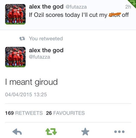 Di laga kontra Arsenal kemarin, ia berjanji akan memotong kemaluannya andai Mesut Ozil mampu mencetak gol, dan faktanya gelandang asal Jerman itu mencetak sebuah gol tendangan bebas yang cantik. Tak lama setelah gol Ozil, futazza buru-buru membalas Tweet-nya sendiri dengan mengatakan kalau yang dia maksud bukanlah Ozil, melainkan Olivier Giroud. Sialnya, di striker andalan Arsenal tersebut juga berhasil mencetak satu gol. Maka lengkaplah sudah penderitaan fans Liverpool tersebut.