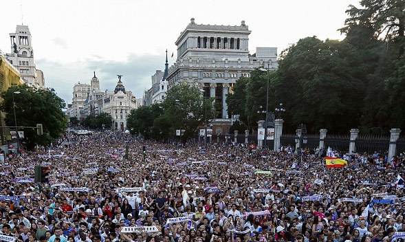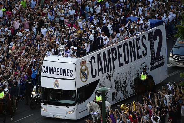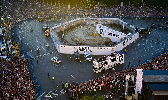 Pesta juara di kota Madrid dipusatkan di dua titik, yakni Estadio Santiago Bernabeu dan Plaza de Cibeles. Berikut beberapa video dan fotonya.