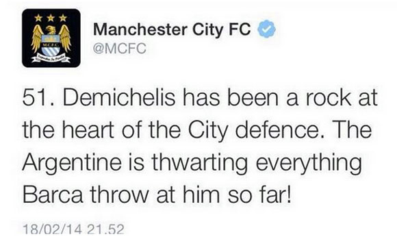 Pada menit 51, akun Twitter resmi City 'melempar' tweet yang memuji permainan Demichelis kepada lebih dari 1,5 juta follower-nya, mengatakan: "Demichelis bagai karang di jantung pertahanan City. Pemain Argentina itu mementahkan semua serangan Barca yang datang ke arahnya sejauh ini."