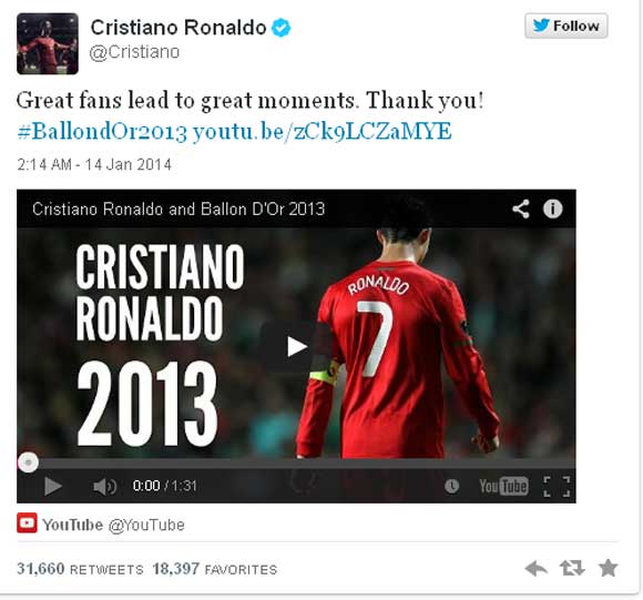 Sebagai bentuk ucapan terimakasih, dalam twit Ronaldo tersebut, ia menyertakan video kompilasi aksinya di atas lapangan di tahun 2013.