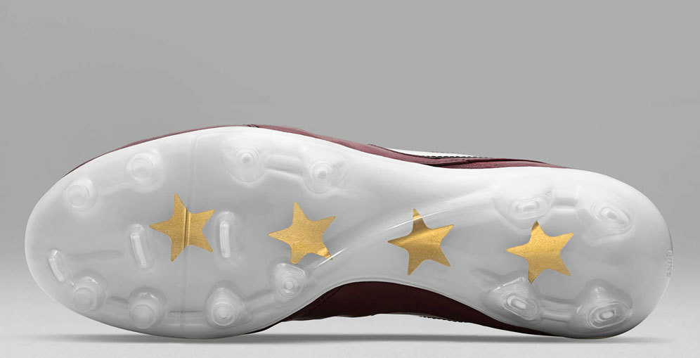 Sepatu ini dilengkapi detail menarik, mulai dari empat bintang emas yang menghiasi bagian sol bawah dan tumit penanda empat gelar juara dunia yang telah diraih Italia.