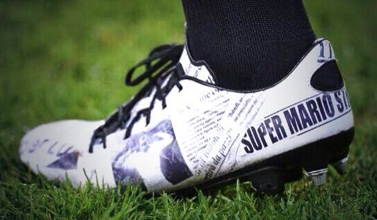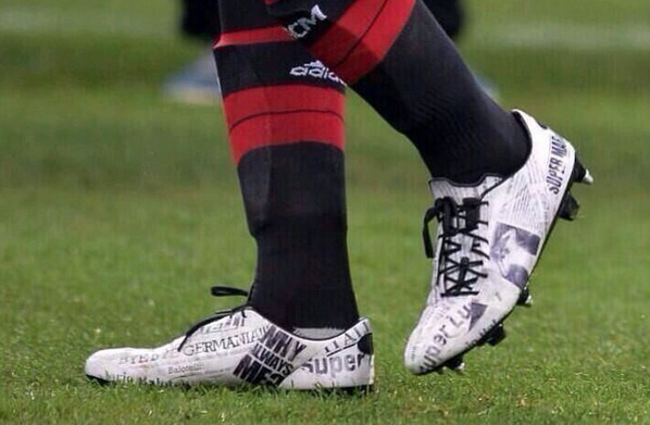 Sepatu Balotelli di-cover dengan sejumlah headline surat kabar tentang perjalanan kariernya. Di antaranya adalah 'Why Always Me' dari momen ketika masih berseragam Manchester City dan 'Bye Bye Germania' usai membawa Italia menyingkirkan Jerman di Euro 2012.