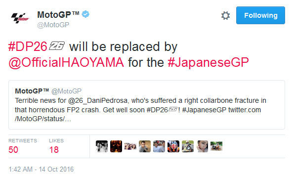 Dengan cedera ini, Pedrosa diperkirakan akan absen pula di MotoGP Australia pekan depan dan MotoGP Malaysia sepekan setelahnya. Jika ia benar-benar absen, maka Aoyama diprediksi akan kembali menggantikannya.