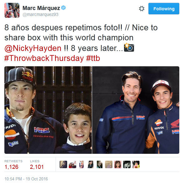 Saking girangnya, Marquez pun mengunggah foto throwback-nya bersama Hayden di akun resmi Twitter dan Instagram miliknya, yakni ketika mereka bertemu pertama kali pada tahun 2008 silam dalam acara presentasi tim balap Repsol di kejuaraan-kejuaraan dunia.