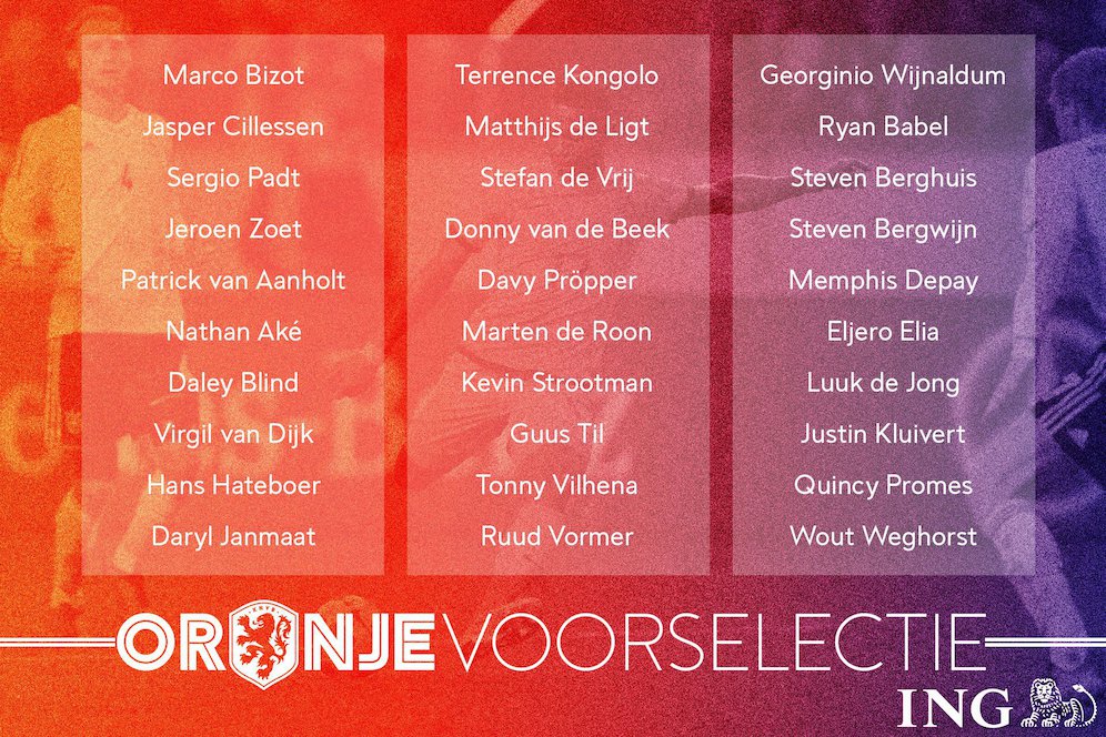 : Ryan Babel (Besiktas), Memphis Depay (Lyon), Eljero Elia (Istanbul Basaksehir), Quincy Promes (Spartak Moscow), Luuk de Jong (PSV), Steven Berghuis (Feyenoord), Steven Bergwijn (PSV), Justin Kluivert (Ajax), Wout Weghorst (AZ)