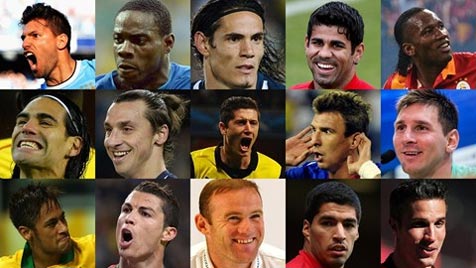 Sergio Agüero; Mario Balotelli; Edinson Cavani; Diego Costa; Cristiano Ronaldo; Didier Drogba; Radamel Falcao; Zlatan Ibrahimovic; Robert Lewandowski; Mario Mandžukić; Lionel Messi; Neymar; Wayne Rooney; Luis Suárez; dan Robin van Persie.