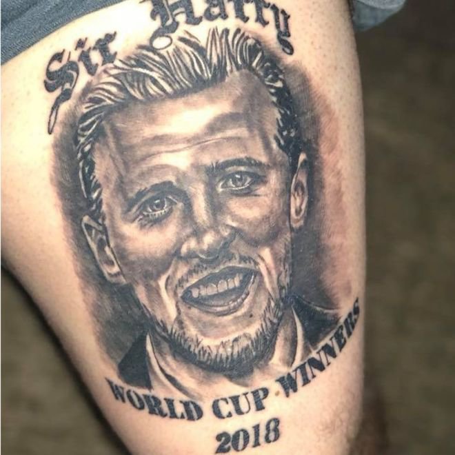 Menukil BBC, salah satu fans Inggris bernama Teddy Allen bahkan merajah ilustrasi wajah Harry Kane di paha kirinya beserta tulisan: "Sir Harry World Cup Winners 2018"