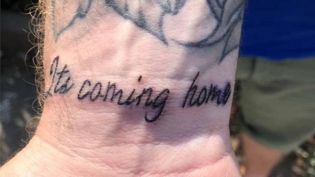 Pria berusia 30 tahun ini juga memutuskan melukis tato "it's coming home" di pergelangan tangan kirinya setelah Inggris mengalahkan Swedia di perempat final lalu.