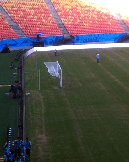 Dilaporkan oleh AFP, permukaan lapangan di di Manaus tersebut terlihat kering terutama di sekitar gawang. Terlihat cukup banyak warna agak kekuningan yang sebetulnya menunjukkan banyaknya bagian yang kering.