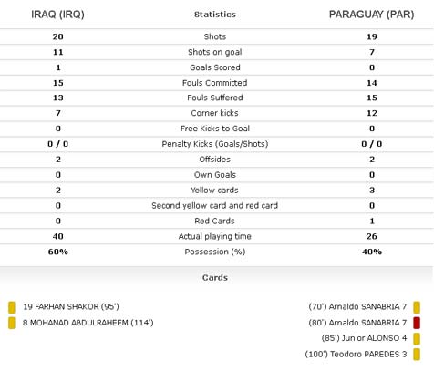 Perjuangan Irak kali ini sama sekali tak mudah. Meski menang, mereka harus bersusah payah mendapatkannya. Adalah Farhan Shakor yang menjadi pahlawan Irak. Berkat gol tunggalnya di masa perpanjangan (94'), timnya memastikan diri melaju ke perempat final.