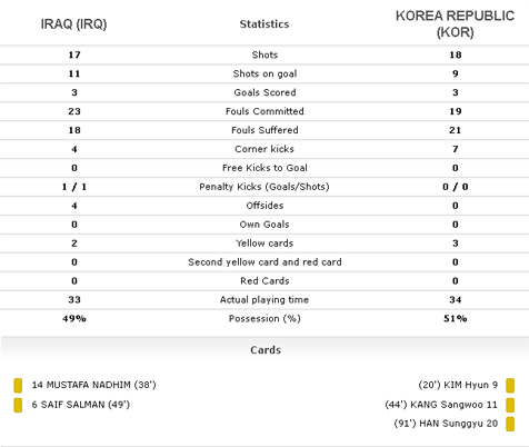 Kedua tim bermain imbang 3-3 hingga extra time yang diberikan wasit berakhir. Gol-gol Irak lahir dari aksi Ali Faez di menit ke 21 melalui eksekusi penalti dan Farhan Shakor (42', 118'). Sedangkan Korea Selatan melalui Kwon Changhoon (25'), Lee Gwanghun (50'), dan Jung Hyuncheol (120'+2).