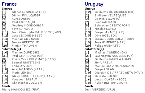 Penampilan kiper kedua tim, Alphonse Areola (Prancis) dan Guillermo De Amores (Uruguay) patut mendapat acungan jempol. Berkali-kali keduanya berjibaku untuk mengamankan gawang masing-masing, hingga akhirnya waktu memaksa laga ditentukan melalui adu penalti.