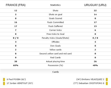 Sepanjang pertandingan di waktu normal, kedua tim sama-sama gagal mencetak gol. Kendati terus melancarkan serangan, namun baik Les Bleus maupun La Celeste masih belum mampu membuka skor, hingga memasuki babak extra time.